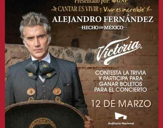 Cerveza Victoria te invita a participar a su concurso en el que podrás ganar boletos gratis para el concierto de Alejandro Fernández en el Auditorio Nacional, si quieres ser ganador realiza la mecánica siguiente: