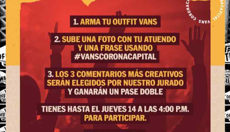 Ingresa a la página de Facebook de Vans y dale like, arma tu outfit Vans y tómate una foto, ubica la publicación del concurso y en los comentarios comparte tu foto con una frase y el hashtag #VansCoronaCapital