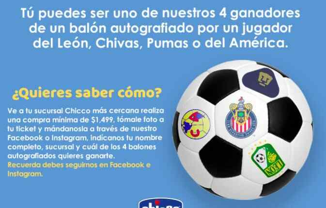 Chicco te invita a participar a su concurso en el que podrás ganar 1 de 4 4 balones autografiados por un jugador de Club León, Chivas, Pumas o América, si quieres ser ganador realiza la mecánica siguiente: