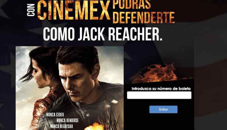 Ingresa a la pagina de Facebook de Cinemex y dale like, ingresa a la página del concurso en https://cinemex.com/landing/promos?nl=tf en la que tendrás que registrarte mediante tu número de boleto, es decir deberás haber visto la película Jack Reacher en salas Cinemex.