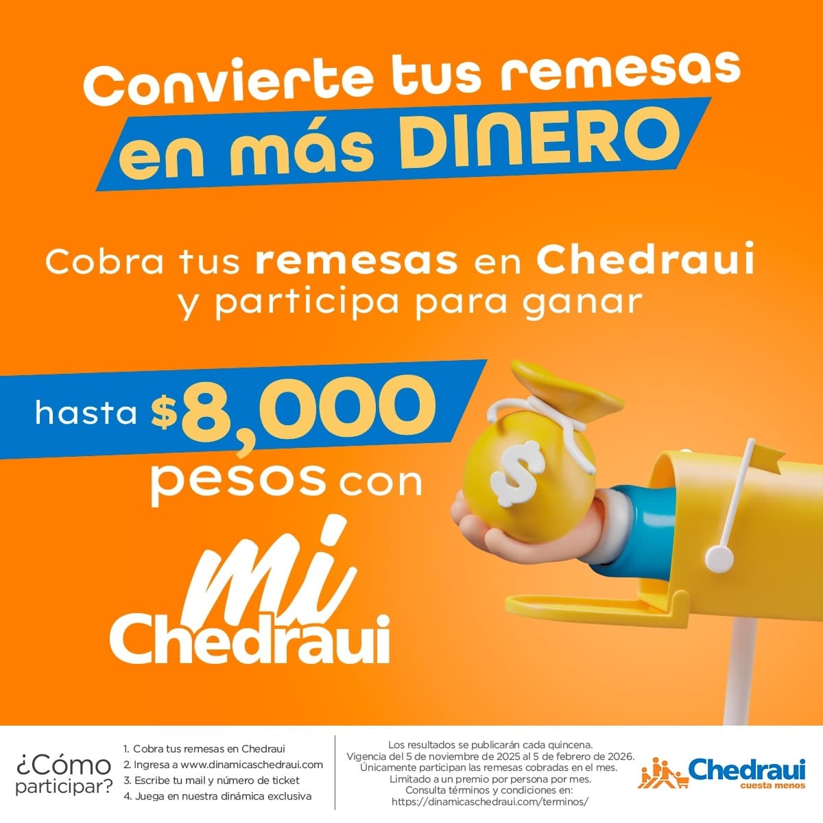 Cobra tus remesas en Chedraui entre el 5 de noviembre de 2025 y el 5 de febrero de 2026. Ingresa a https://www.dinamicaschedraui.com/, registra tu correo electrónico, número de ticket y juega en la dinámica exclusiva.