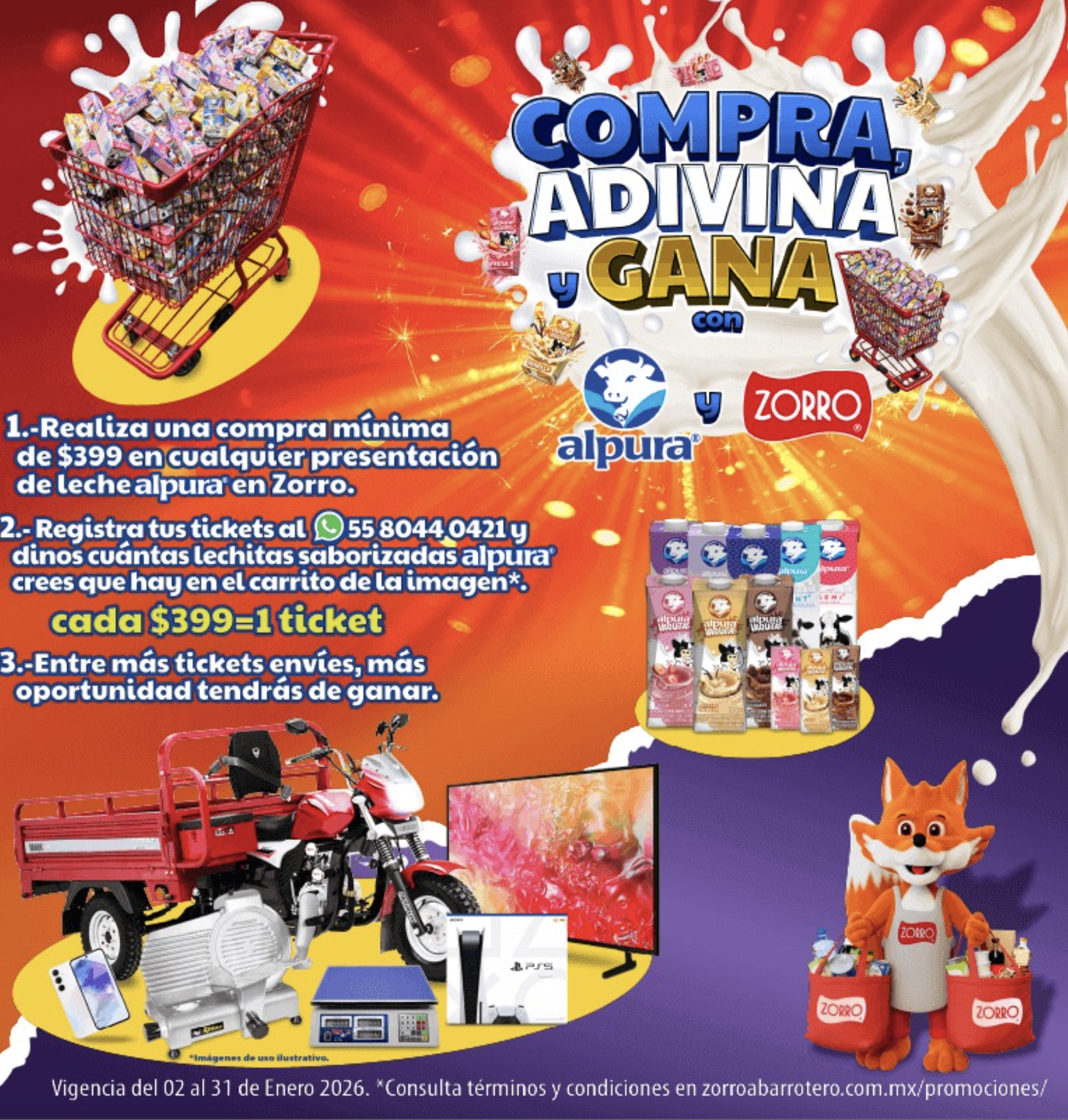 Realiza una compra mínima de $399.00 de cualquier presentación de Leches Alpura en Zorro Abarrotero, entre el 2 y el 31 de enero de 2026 y conserva tu ticket de compra. Envía un mensaje vía WhatsApp al 55 8044 0421, en el mensaje deberás enviar lo siguiente:
