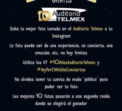 Utiliza los hashtags #10AñosAuditorioTelmex y #VoyPorElAñoDeConciertos, las 10 mejores fotos pasarán a una segunda ronda en donde se elegirá al participante ganador