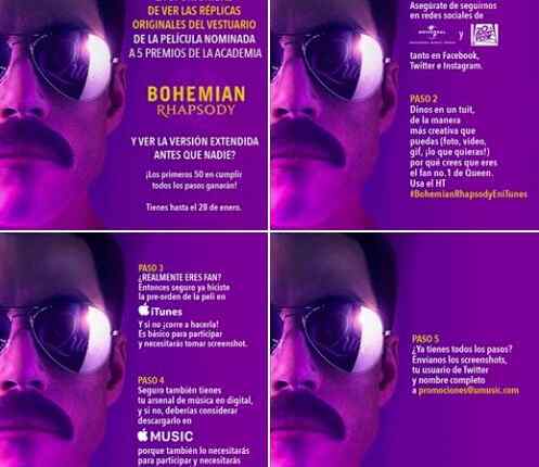 Hazte seguidor de las cuentas de Facebook, Twitter e Instagram de 20th Century Fox Home Entertainment y de las cuentas de Facebook, Twitter e Instagram de Universal Music, menciona en un tuit de la manera más creativa que puedas por qué crees que eres el fan número 1 de Queen. usando el hashtag #BohemianRhapsodyEniTunes
