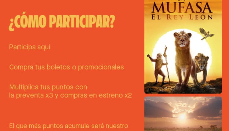 Una vez que se active la promoción se empezarán a contabilizar los puntos de todas las compras de boletos para Mufasa y vasos coleccionables de Mufasa que realices. Cada compra generará puntos dentro para ganar, cada peso de compra generará 1 punto. La compra de boletos para Mufasa en preventa se multiplica por 3.