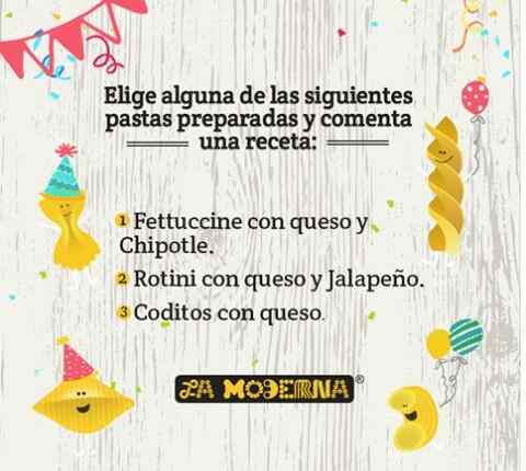 Ingresa a la página de Facebook de La Moderna y dale like, ubica la publicación del concurso y elige alguna de las pastas preparadas participantes (fettuccine con queso y chipotle, rotini con queso y Jalapeño o coditos con queso)