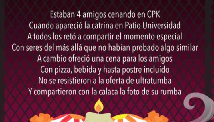 Patio Universidad te invita a participar a su concurso de Calaveritas en el que podrás ganar una cena en California Pizza Kitchen para ti y 3 amigos, si quieres ser ganador realiza la mecánica siguiente: