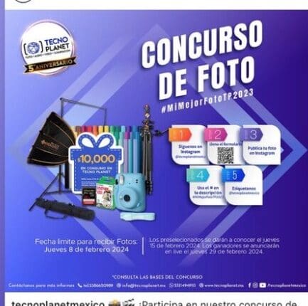 Hazte seguidor de la cuenta de Instagram de @tecnoplanetmexico y llena el formulario de participación con tus datos de contacto. Realiza un reel con un detrás de cámaras de tus sesiones de foto o video del 2023 o comparte tu mejor foto del 2023 en tu cuenta de Instagram.