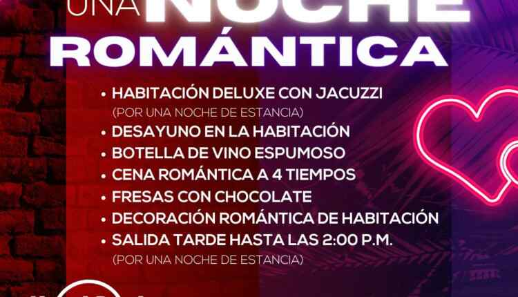 – Una noche de hospedaje en habitación deluxe con jacuzzi decorada románticamente, desayuno en la habitación, botella de vino espumoso y fresas con chocolate.