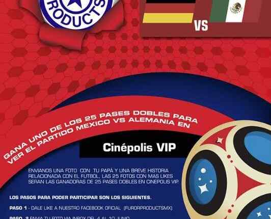 Furor Products te invita a participar a su concurso en el que podrás ganar boletos a Cinépolis VIP para ver el partido México vs. Alemania, si quieres ser ganador realiza la mecánica siguiente: