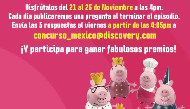 Desde el 21 y hasta el 25 de Noviembre del 2016 a las 16:00 horas se estrenará un capítulo de Peppa Pig, al término de cada episodio nuevo se realizara una pregunta dentro del Facebook de Discovery Kids el viernes 25 de Noviembre a partir de las 16:05 horás podrás enviar todas tus respuestas a concurso_mexico@discovery.com