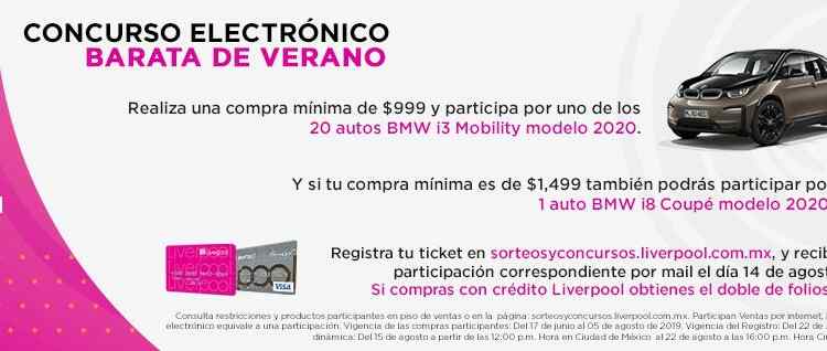 Concurso Electrónico Liverpool Gran Barata de Verano 2019: Gana autos BMW i3 o un BMW i8 2020 en sorteosyconcursos.liverpool.com.mx