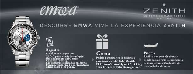 Emwa y el centro comercial Perisur te invitan a participar en su promoción Descubre Emwa vive la experiencia Zenith, con la que podrás ganar un reloj Zenith Stratos tributo a Félix Baumgartner de más de US$12,000 dólares.