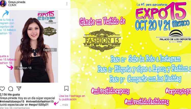 Para poder participar deberás tener una cuenta publica de Instagram y hacerte seguidor de las cuentas de @vestidosfashion15 y @expo15mexico, sube a tu cuenta de Instagram con los logos Expo15 20 y 21 de octubre del 2018 en el Palacio de los Deportes y Fashion 15