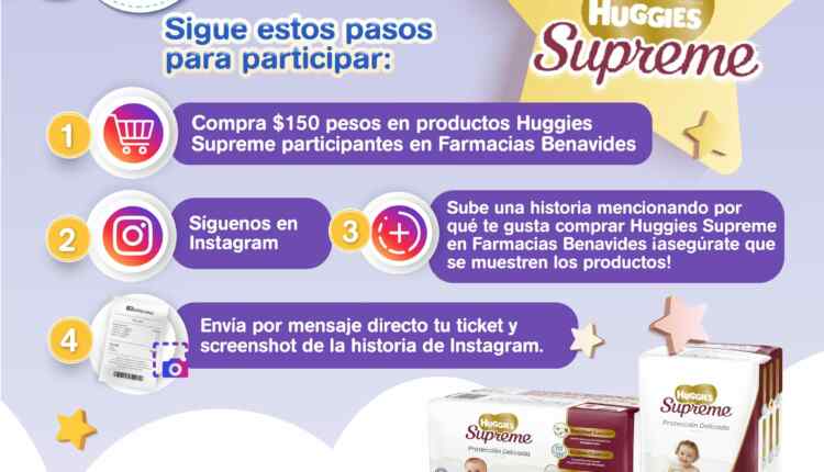 Hazte seguidor de la cuenta de Instagram de @farmaciasbenavides y sube una historia en modo público etiquetando a Farmacias Benavides incluyendo el producto de Huggies Supreme y un beneficio de comprar dichos productos en Farmacias Benavides, por último envía por mensaje directo el ticket de compra que incluya los productos Huggies Supreme y un screenshot de la historia.