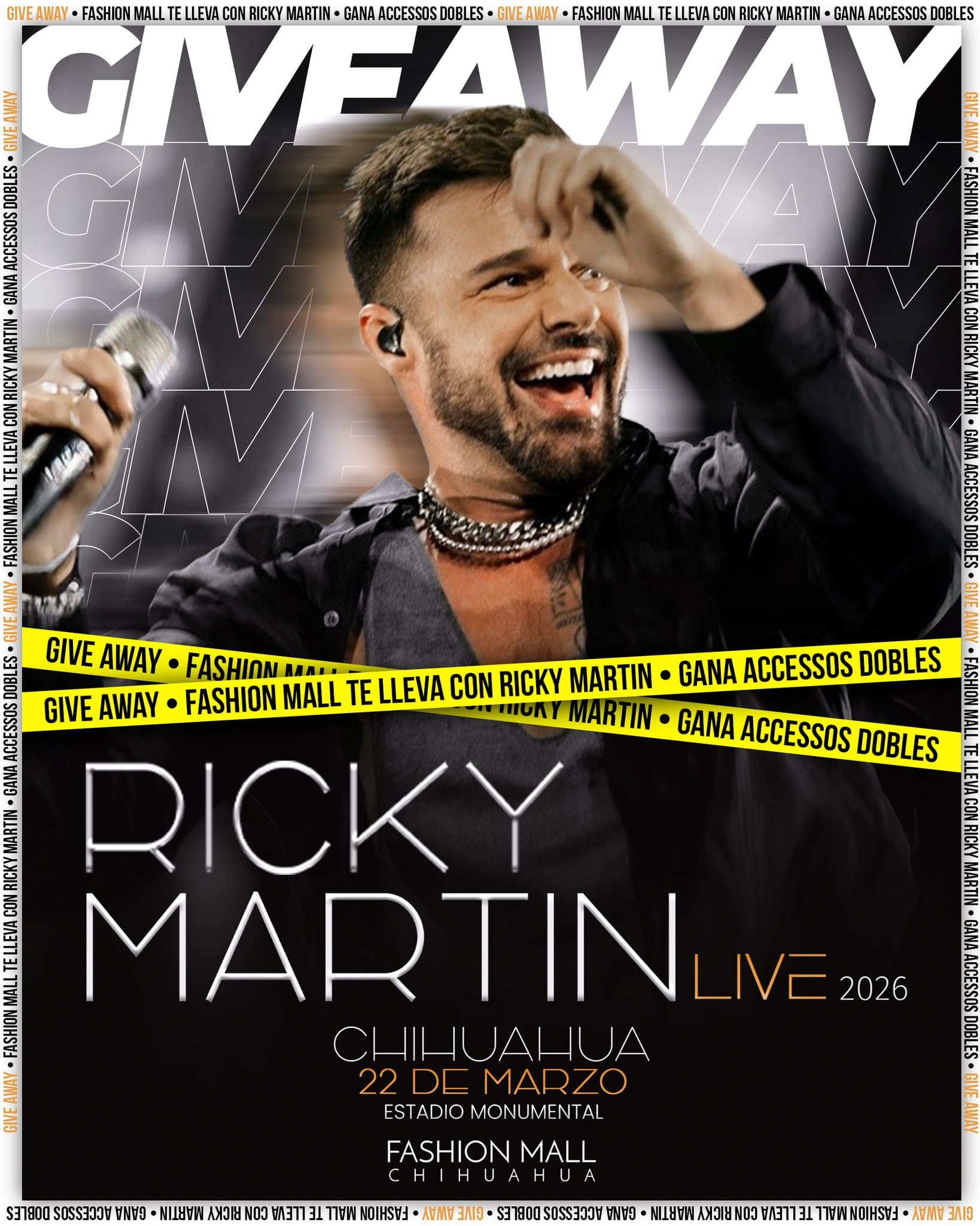 Fashion Mall Chihuahua regalará a los participantes ganadores: Un acceso doble para ver a Ricky Martin en el Estadio Monumental, el 22 de marzo de 2026.