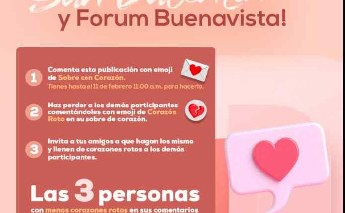 Ingresa a la página de Facebook de Forum Buenavista y dale like, ubica la publicación del concurso, dale like y coméntala con el emoji 💌 , limita a tus contrincantes dejándoles el emoji 💔 en sus 💌, solo un 💔 por comentario, pero pueden ser la cantidad de comentarios que quieras.