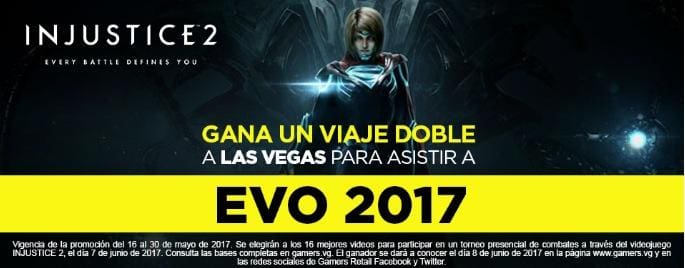Compra el video juego Injustice 2 en Gamers, graba un video mostrando tu mejor combate, compártelo, compite en los combates presenciales y gana viaje al EVO 2017 en Las Vegas