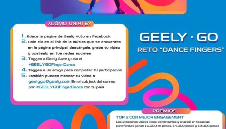 Debes etiquetar a un amigo para completar tu participación. También puedes enviar tu video vía correo electrónico a geelygo@geely.com y en el asunto del correo debes poner: #GeelyGoFingerDance y tu país. Los mejores 20 videos serán los ganadores.