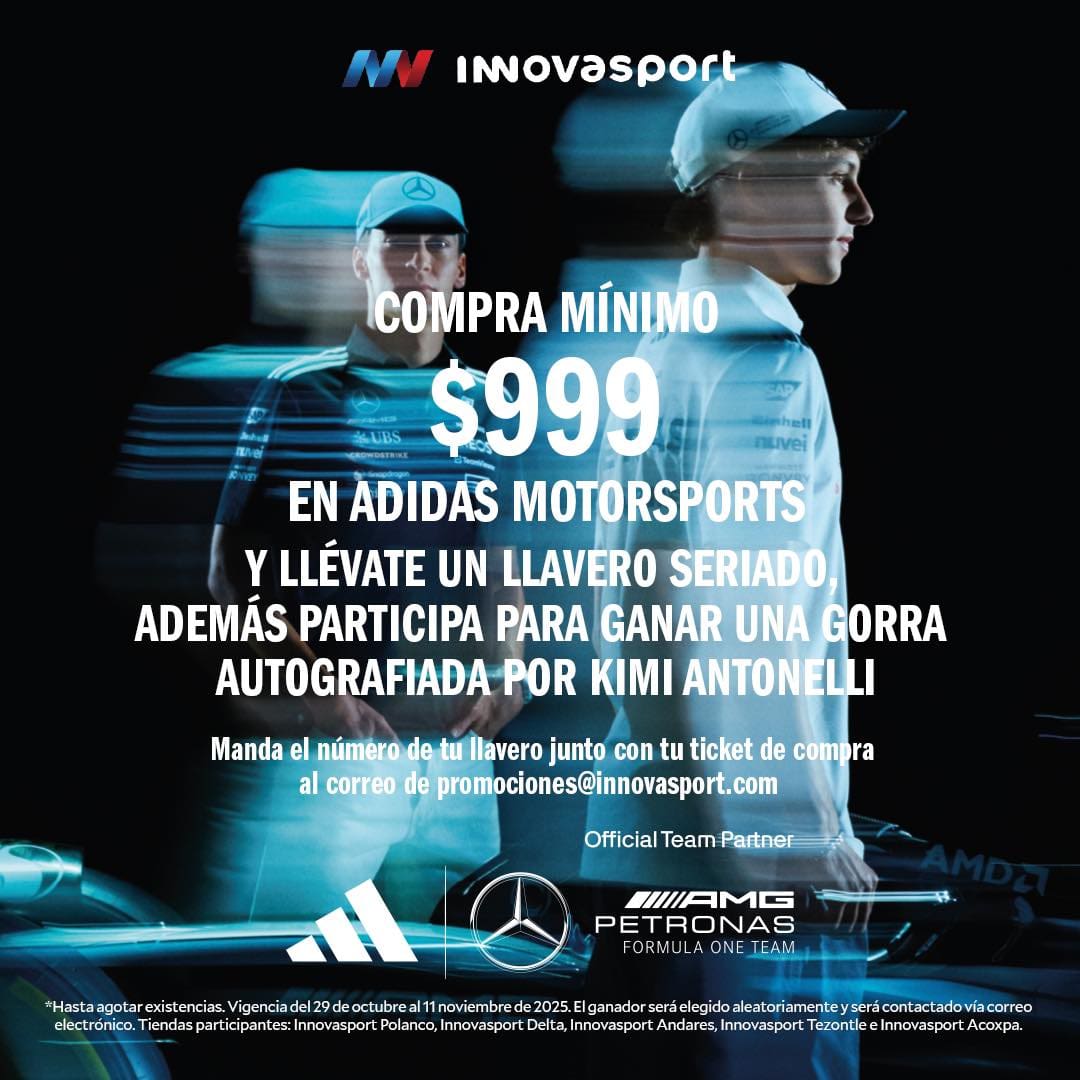 Realiza una compra mínima de $999.00 de productos adidas Motorsports en tiendas Innovasport participantes (Polanco, Parque Delta, Andares, Parque Tezontle y Acoxpa), entre el 29 de octubre y el 11 de noviembre de 2025.