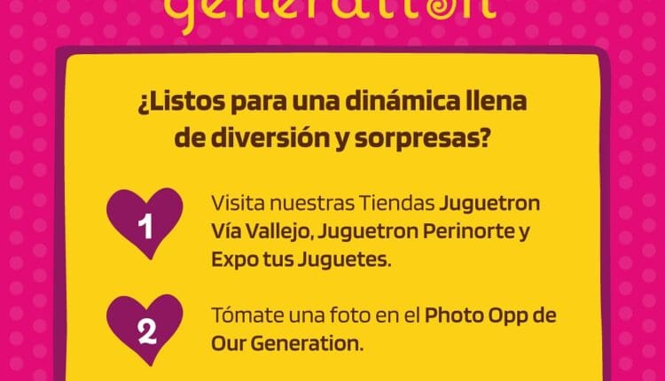 Visita alguna de las tiendas Juguetron participantes (Vía Vallejo, Perinorte ó Expo Tus Juguetes), entre el 18 de diciembre de 2024 y el 5 de enero de 2025 y tómate una foto en el Photo Opp de Our Generation.