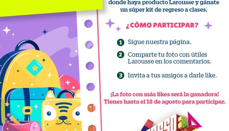 Ingresa a la página de Facebook de Larousse Kids y dale like, ubica la publicación del concurso, dale like y en los comentarios comparte una foto de tus útiles escolares donde haya productos Larousse.