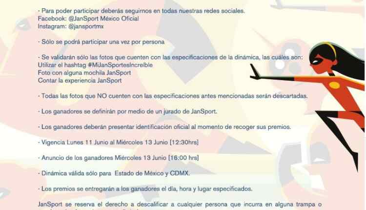 Hazte seguidor de las cuentas de Facebook e Instagram de JanSport México, comparte de forma pública en tu cuenta de Facebook o Instagram una foto de tu JanSport, menciona por qué es increíble y usa el hashtag #MiJanSportEsIncreíble