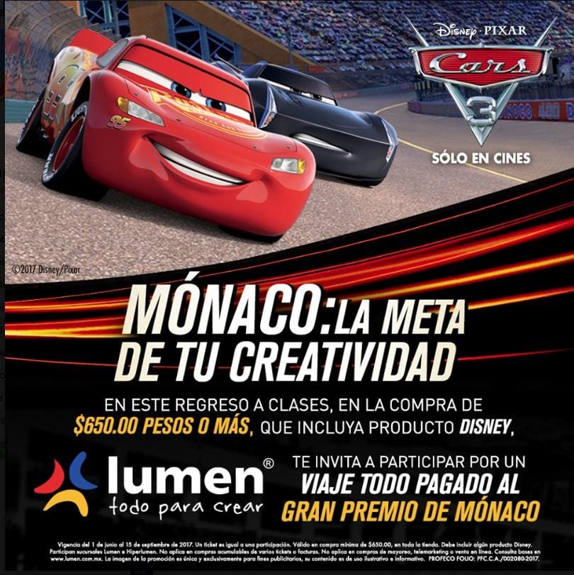 Papelería Lumen y Cars 3 te invitan a participar en su concurso en el que podrás ganar viaje todo pagado al Gran Premio de Mónaco, si quieres ser ganador realiza la mecánica siguiente:
