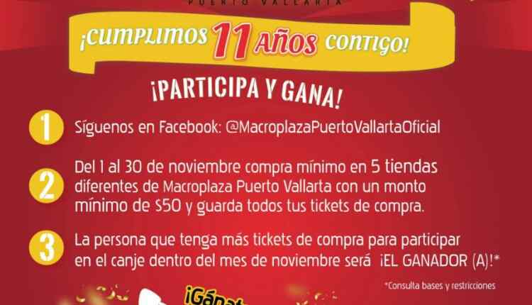 Ingresa a la página de Facebook de Macroplaza Puerto Vallarta y dale like, realiza compras mínimas de $50.00 en por lo menos 5 tiendas diferentes de Macroplaza Puerto Vallarta entre el 1 y el 30 de noviembre de 2020.
