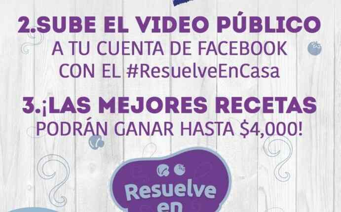 Comparte tu videoreceta en un posteo público en tu cuenta de Facebook, indica el nombre de la receta, utiliza el hashtag #ResuelveEnCasa y etiqueta la cuenta de la marca participante que usaste en tu receta
