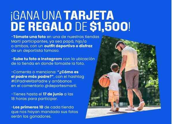 Sube tu foto a tu cuenta de Instagram con la ubicación de la tienda en donde tomaste la foto, menciona cómo es el padre más padre, con el hashtag #ElPadreMásPadre y etiqueta a @deportesmarti. Los primeros 10 de cada tienda que nos hayan mandado sus fotos serán los ganadores.