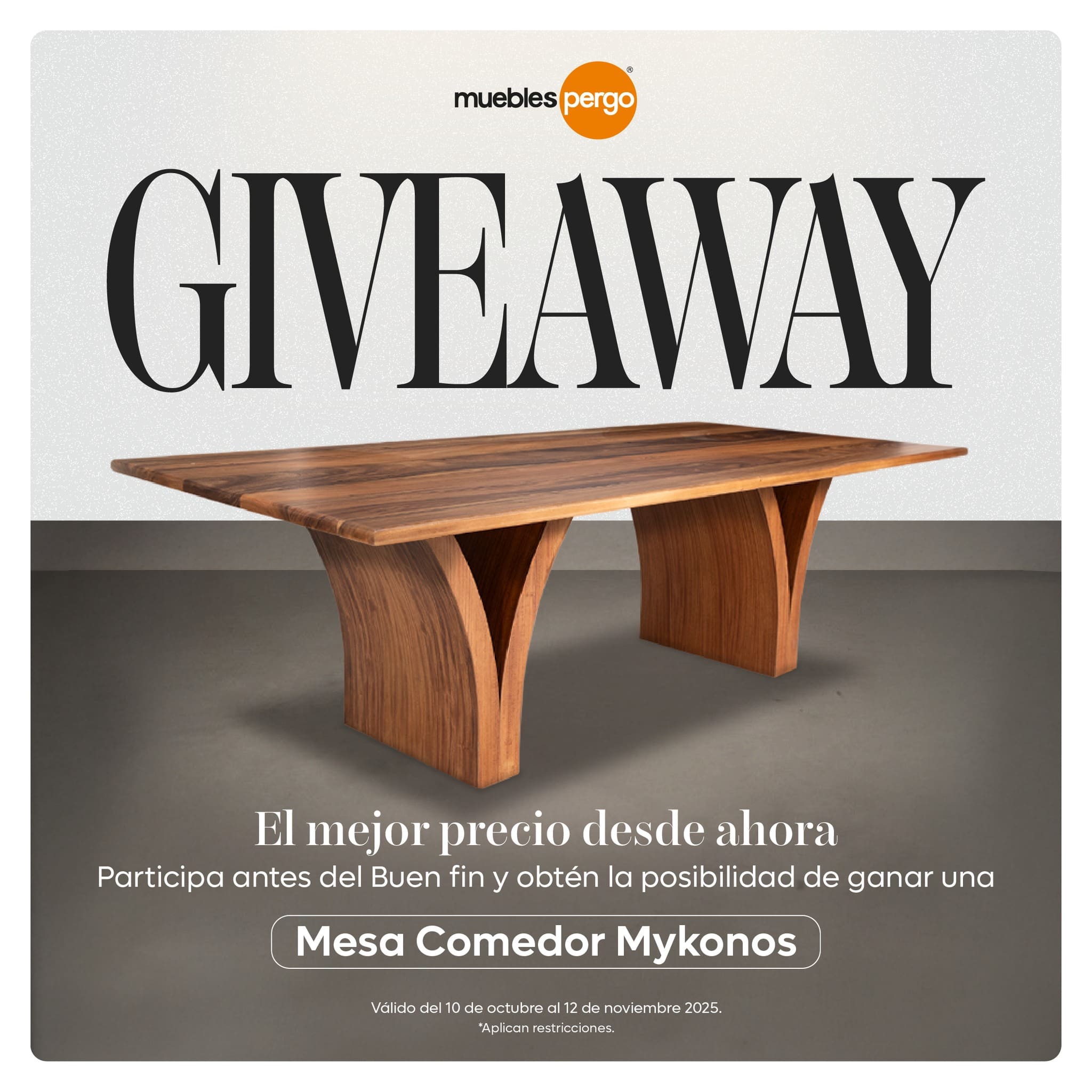 Muebles Pergo te invita a participar a su concurso Buen Fin 2025 en el que podrás ganar una Mesa de Comedor Mykonos, si quieres ser ganador realiza la mecánica siguiente: