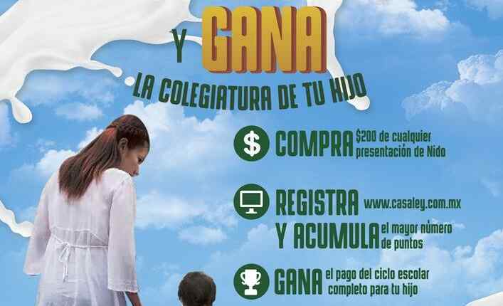 Casa Ley y Nido te invitan a participar a su concurso en el que podrás ganar 1 de 9 premios de pago de colegiatura para tu hijo, si quieres ser ganador realiza la mecánica siguiente: