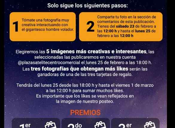 Plaza Satélite Centro Comercial te invita a participar a su concurso Flying Man en el que podrás ganartarjetas de regalo de $500 a $2,000 pesos, si quieres ser ganador reaizala mecánica siguiente:
