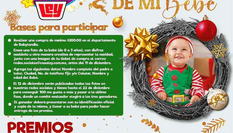 Realiza una compra mínima de $200 en el departamento de Babylandia de Casa Ley y conserva tu ticket de compra. Toma una foto de tu bebé de 0 a 3 años con un disfraz navideño u otra manera creativa de representar la navidad y envíala junto con una imagen de tu ticket de compra vía correo electrónico a redes.sociales@casaley.com.mx.