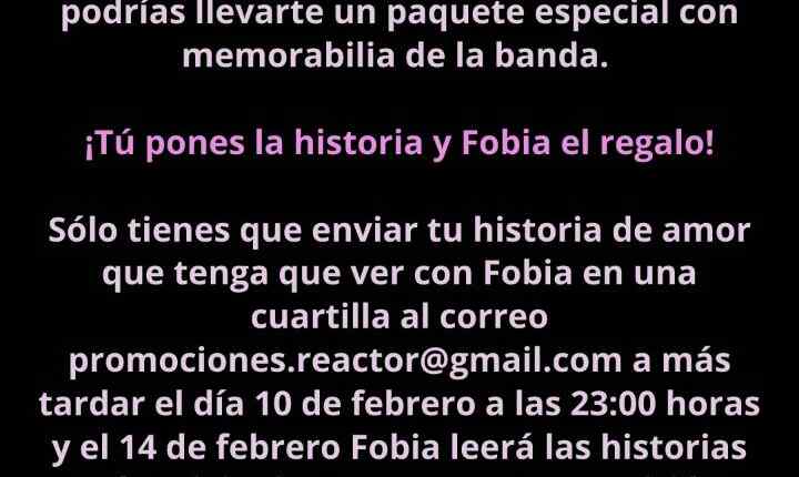 Envía tu historia de amor que tenga que ver con Fobia en una cuartilla vía correo electrónico a promociones.reactor@gmail.com.