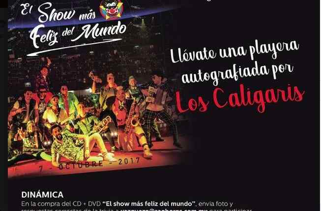 Compra en Sanborns el CD+DVD de Los Caligaris “El Show Más Feiiz Del Mundo” y guarda tu ticket de compra, ubica la publicación del concurso en la que habrá una trivia la cuál deberás responder correctamente