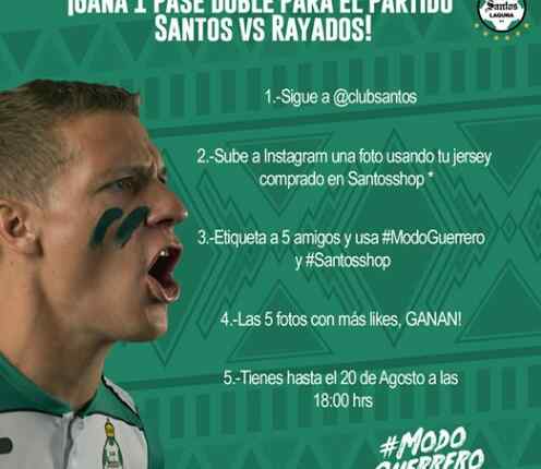 En tu foto etiqueta a 5 amigos y utiliza los hashtags #ModoGuerrero y #SantosShop, pide a tus amigos y familiares que le den like a tu foto, al término del concurso los 5 participantes que tengan más likes ganarán