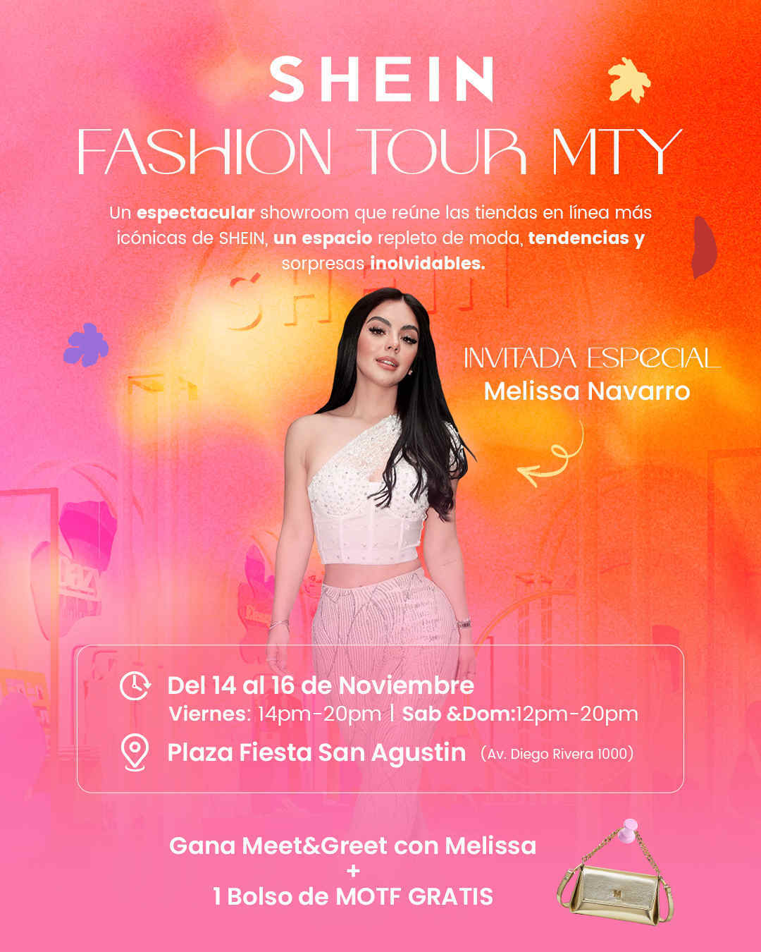 • 5 Ganadores de: Un acceso cada uno para conocer y tomarse fotos con la influencer Melissa Navarro y un bolso de la fashion store que ella representa (MOTF), este será entregado en el showroom Shein Fashion Tour Monterrey que se llevara a cabo en el centro comercial Plaza Fiesta San Agustín.