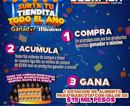 Ganador, Minino y Scorpion te invitan a participar a su concurso Surte tu Tiendita todo el Año en el que podrás ganar $19,000.00 en alimentos para mascota, si quieres ser ganador realiza la mecánica siguiente: