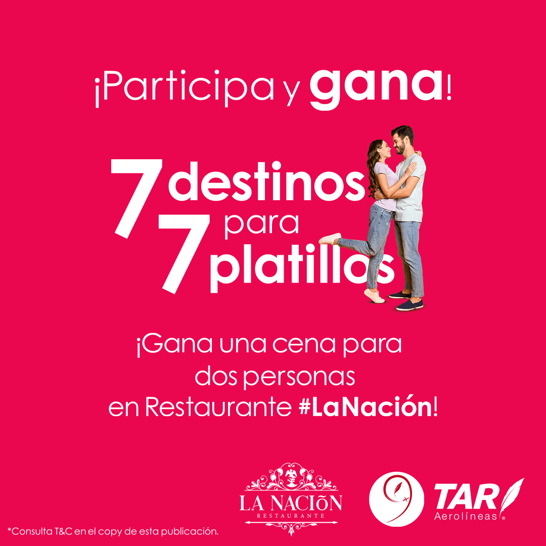 TAR Aerolíneas regalará al participante ganador: Una cena para 2 personas en el restaurante La Nación con monto de $1,000.00, no incluye servicio. Si se excede del monto, este será cubierto por el comensal.