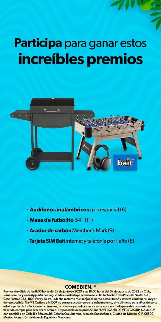 Sam’s Club te invita a participar a su concurso VacacioNestlé en el que podrás ganar 1 de 6 AirPods Max, 1 de 11 futbolitos y más, si quieres ser ganador realiza la mecánica siguiente: