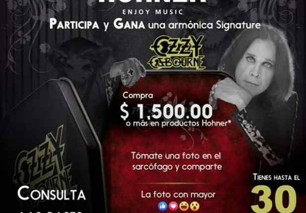 Visita cualquiera de las sucursales Veerkamp Palacio de la música y realiza una compra mínima de $1,500.00 en armónicas Hohner y/o accesorios Hohner, tómate una foto en el sarcófago gigante de Ozzy Osbourne con tu ticket o los productos Hohner que compraste