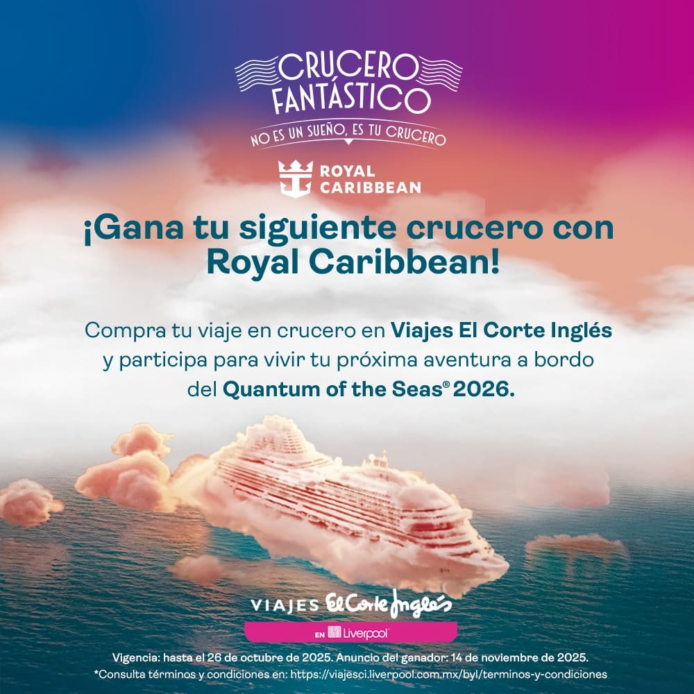 Hazte seguidor de las cuentas de Facebook e Instagram de Viajes El Corte Inglés México. Compra tu crucero de Royal Caribbean a través de cualquiera de los canales de Viajes El Corte Inglés (presencial, telefónico o en línea), entre el 29 de septiembre y el 26 de octubre de 2025.