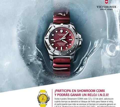 Visita el Showroom de Victorinox en en Avenida Universidad 1627, Col. Florida, Delegación Álvaro Obregón, CDMX y adivina en cuánto tiempo se derretirá el bloque de hielo para liberar el reloj, este estará en el Showroom