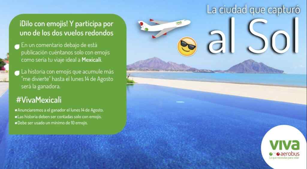 Ingresa a la página de Facebook de Viva Aerobus y dale like, ubica la publicación del concurso y en a sección de comentarios cuenta una historia con mínimo 10 emojis de como sería tu viaje ideal a Mexicali