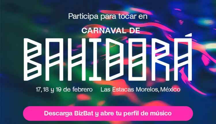 En este concurso el Carnaval de Bahidorá está buscando un acto que sea parte de su próxima edición este 17, 18 y 19 de febrero de 2023 en las Estacas, Morelos. Para participar es necesario que descargues la app BizBat, abras tu perfil de músico y sigas todas las instrucciones que encontrarás en la sección de “OFERTAS #Bahidora2023xBB”.