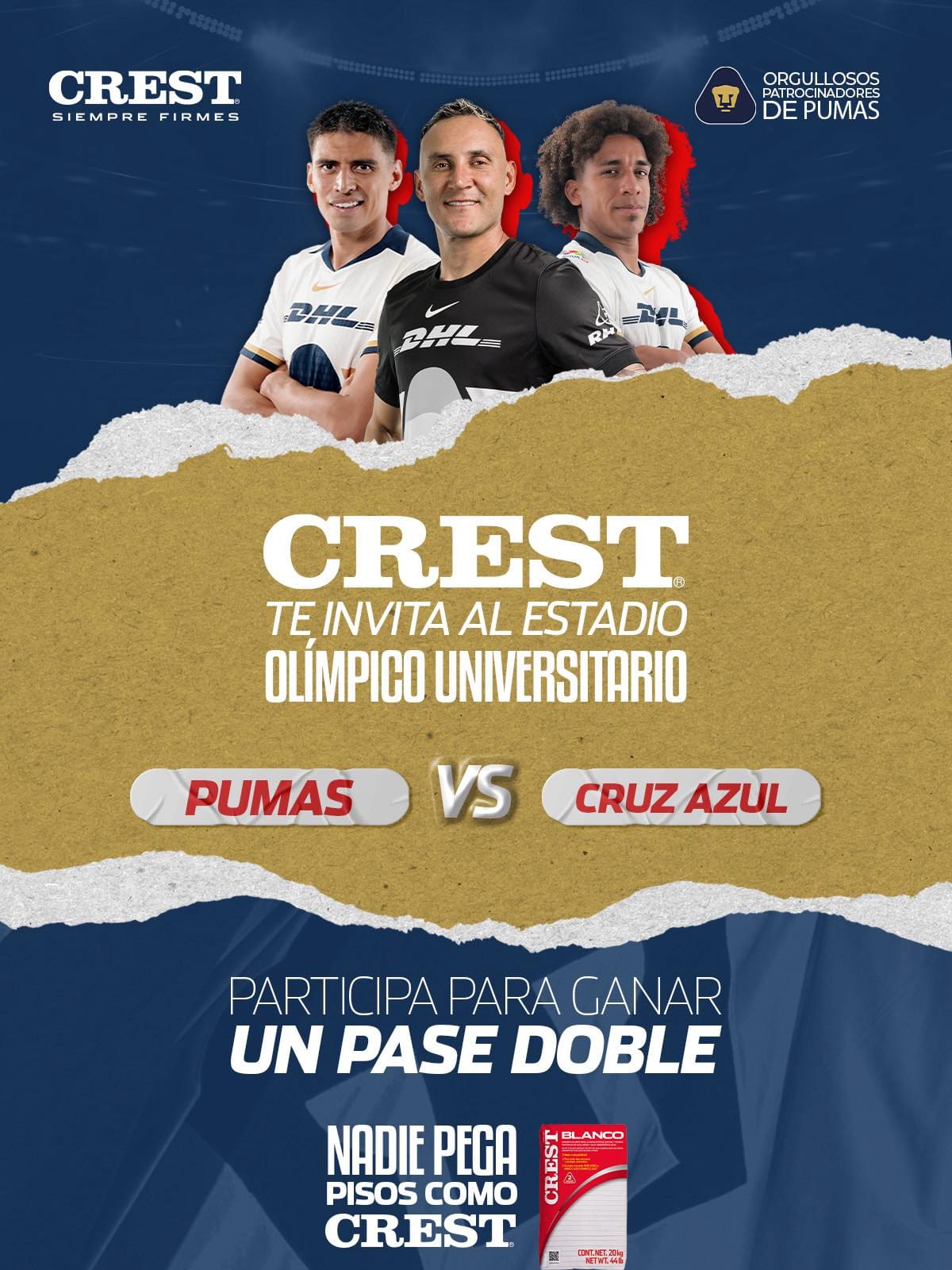 CREST Mexico regalará a los participantes ganadores: Un pase doble para asistir al partido de Pumas vs Cruz Azul este 14 de marzo de 2026, en el Estadio Olímpico Universitario.