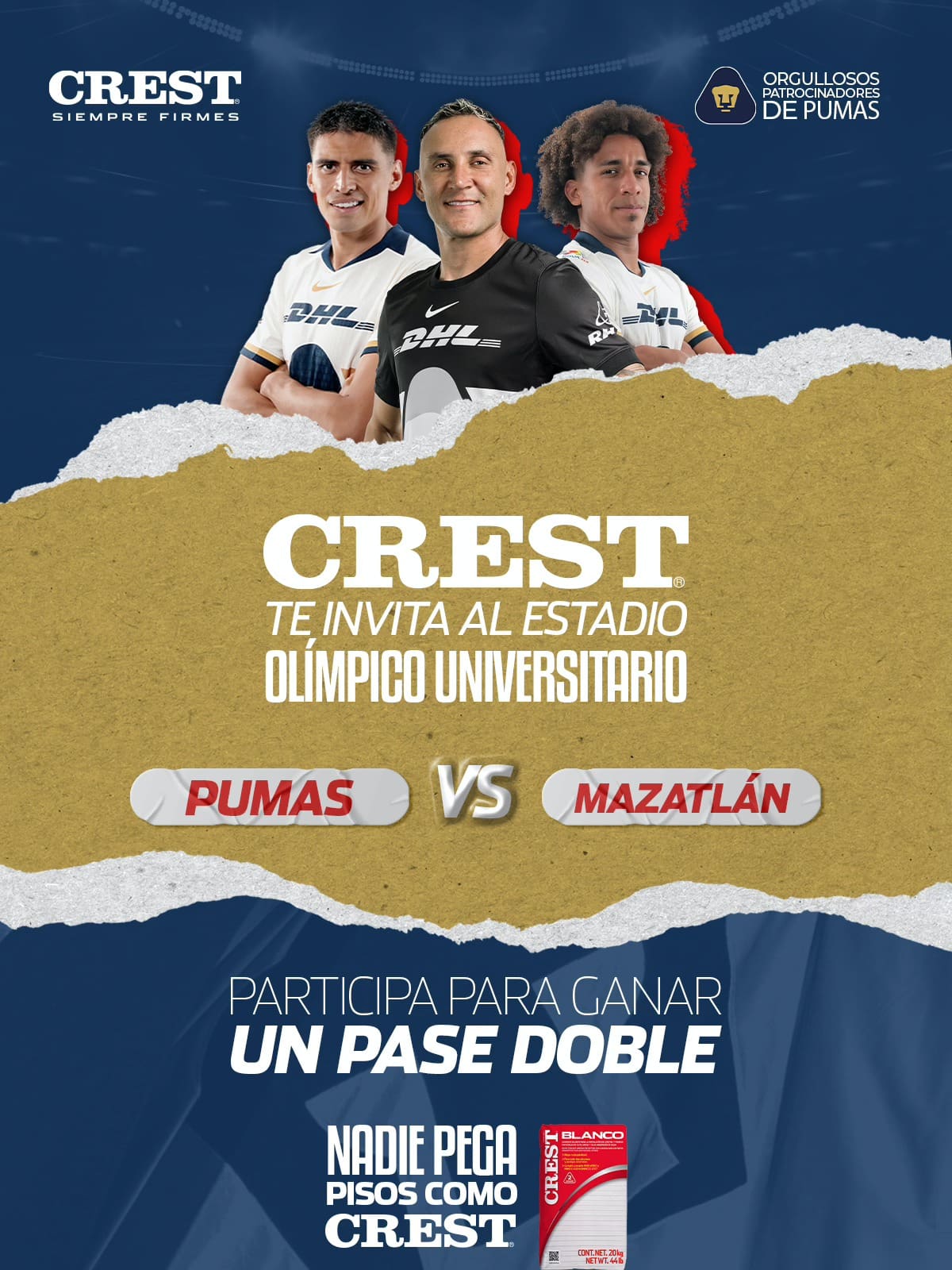 CREST Mexico regalará a los participantes ganadores: Un pase doble para asistir al partido de Pumas vs Mazatlán este 12 de abril de 2026, en el Estadio Olímpico Universitario.