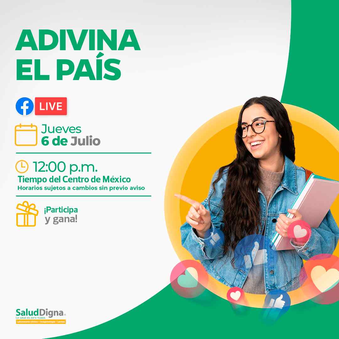 Únete a la transmisión en vivo hoy jueves 6 de julio de 2023 en punto de las 12:00 horas a través de la página de Facebook de Salud Digna. Durante la transmisión se te presentarán pistas que enlazan al país de quien se está hablando y deberás comentar correctamente en nombre del país..
